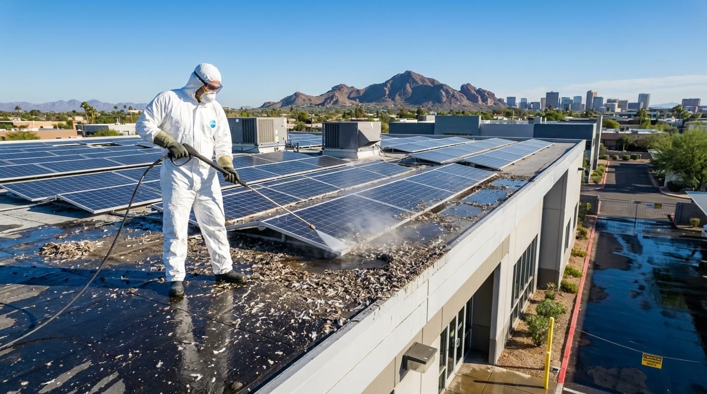 Additionally, the rising popularity of solar energy in Arizona has created a perfect storm for pigeon damage. Pigeons love to nest underneath warm, shaded solar panels. The accumulated droppings and nesting materials not only damage the delicate wiring but also severely reduce the energy efficiency of the panels. Protecting your investment requires specialized roof pressure washing and dedicated solar panel cleaning to safely eliminate the acidic buildup before irreversible damage occurs.